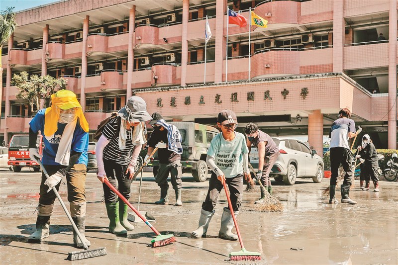 花蓮縣光復國中昨天持續清理校園,各地義工趕工,要讓學校今天能正常上課。圖/曾原信