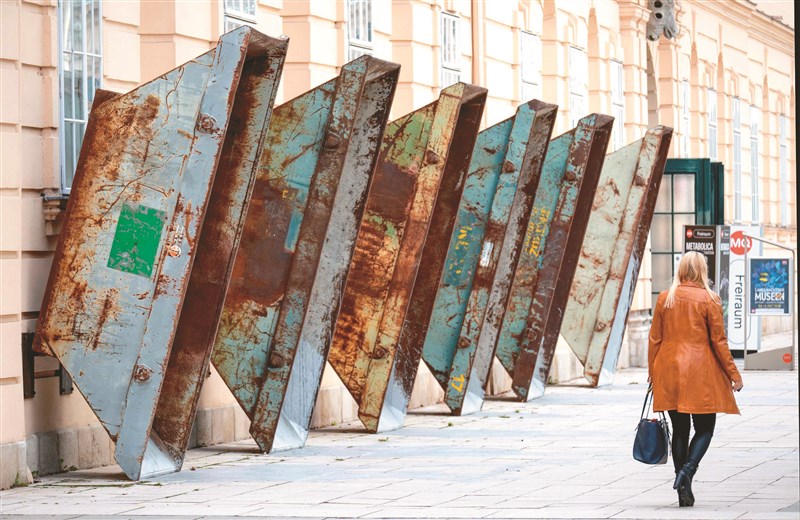 一名女子近日走過瑞士藝術家埃姆赫的藝術裝置〈失衡〉中的垃圾箱展示空間,作品在奧地利維也納博物館區庭院展出。埃姆赫將標準的垃圾桶布置成傾斜的雕塑型態,銀色塗料緩緩地自傾斜容器的邊緣留下,並在地面留下抽象的痕跡。這是種控制卻又充滿詩意的姿態,讓人聯想到行動繪畫。垃圾箱本身厚重而實用,成為控制與機遇、物質與意義、宏偉與脆弱之間巧妙平衡的容器。圖/法新社