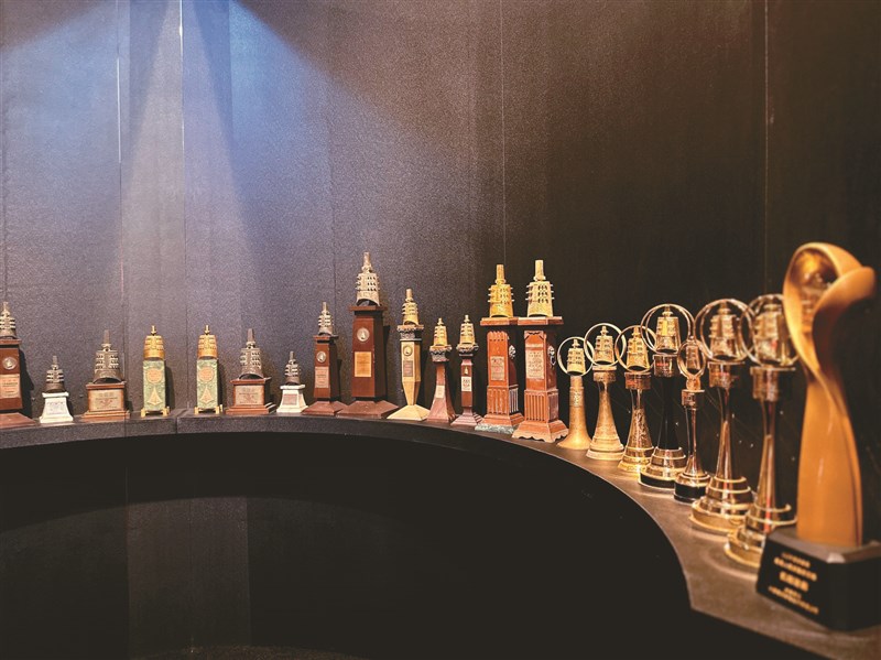 在「THE MOMENT關於那些世代的事:見證金鐘與時代的第一次」展區中,可看到歷屆金鐘獎座等展品。
