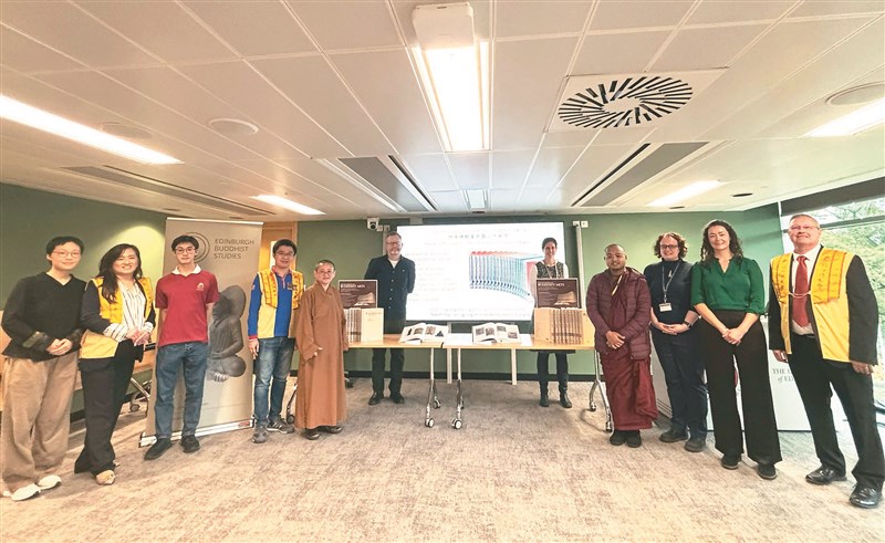 英國曼城佛光山監寺有舜法師(左5)代表捐贈《世界佛教美術圖典大辭典》,予愛丁堡大學。圖為曼城佛光人與愛丁堡大學校方代表合影。圖/曼城佛光山提供