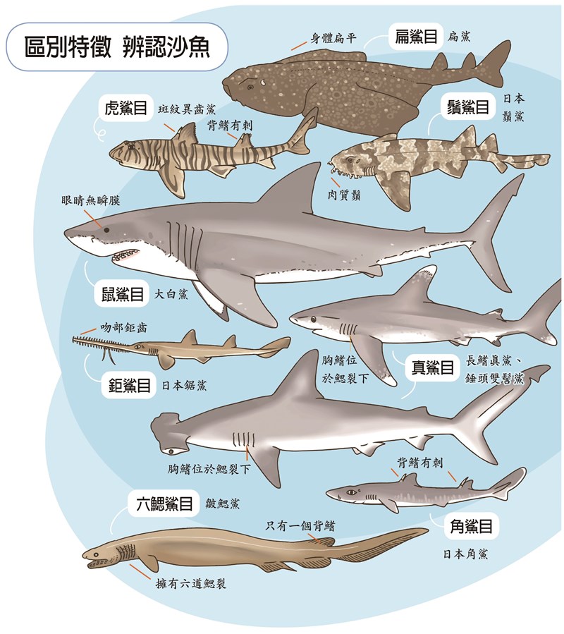 沙魚家族包含上百種,牠們外觀迥異,有在大洋狩獵的,也有在水底啃食貝類的,外觀可不限於「大白鯊」的典型形象。請容我簡介沙魚的身體構造與冷知識吧!