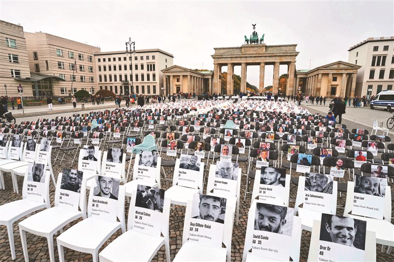 為紀念巴勒斯坦武裝組織哈瑪斯襲擊以色列2周年,德國柏林布蘭登堡大門前的巴黎廣場,7日擺放逾千張附有遇難者照片的椅子。圖/美聯社