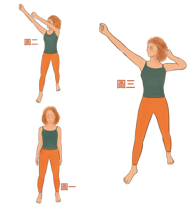 二、右腳向右前方踏出一小步,上半身微微右旋,雙臂向右上方高舉,高度超過肩膊並握拳(圖二) 。