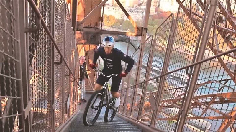 【本報綜合外電報導】法國網紅兼登山自行車好手方特諾瓦(Aurelien Fontenoy)日前僅用12分30秒完成一項驚人挑戰,他騎著自行車沿著686級台階,成功登上巴黎艾菲爾鐵塔第2層平台,並刷新世界紀錄。