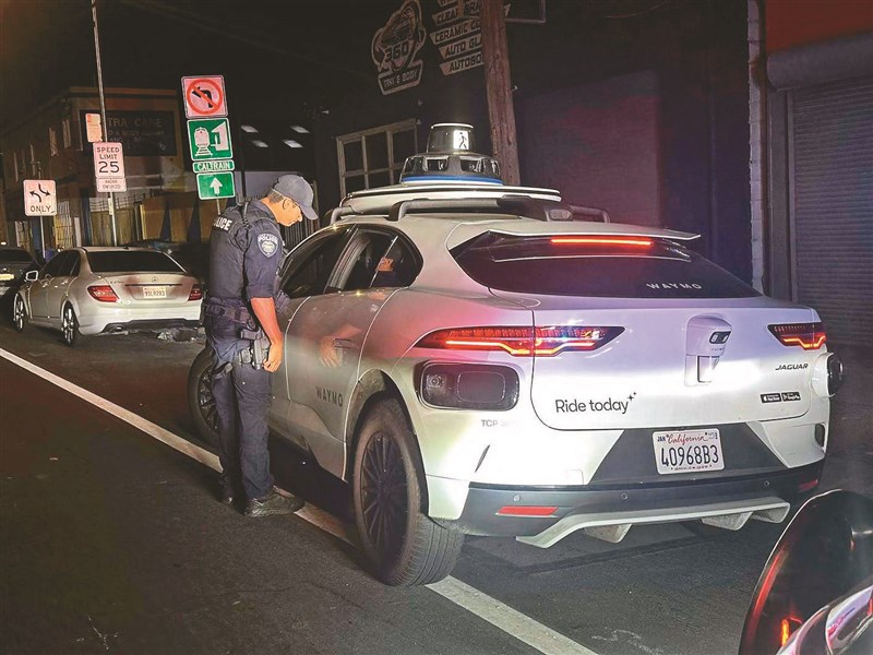 【本報綜合外電報導】美國加州聖布魯諾警察局在社交媒體分享一則趣聞,員警日前執行酒駕檢查時,一輛Waymo自駕計程車突然在他們面前違規掉頭,當員警攔下這輛車上前盤查時,卻發現車內根本沒有人駕駛,讓現場人員啼笑皆非,導致警方無法開罰單。
