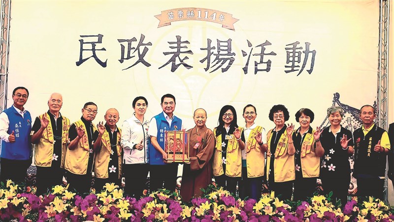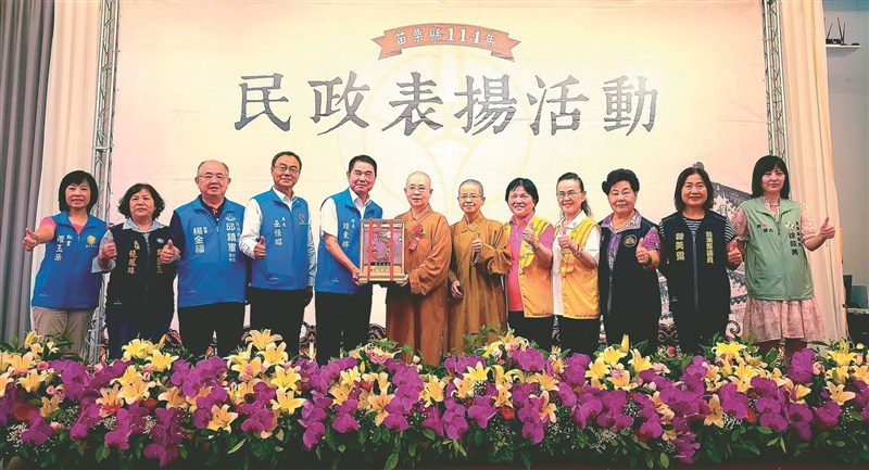佛光山宏法社榮獲「114年度苗栗縣績優宗教團體」殊榮,苗栗縣縣長鍾東錦(左6)頒獎,宏法社監寺妙林法師(右7)、國際佛光會桃竹苗區協會長林依潔(右6)等人代表受獎。圖/人間社記者林美珍