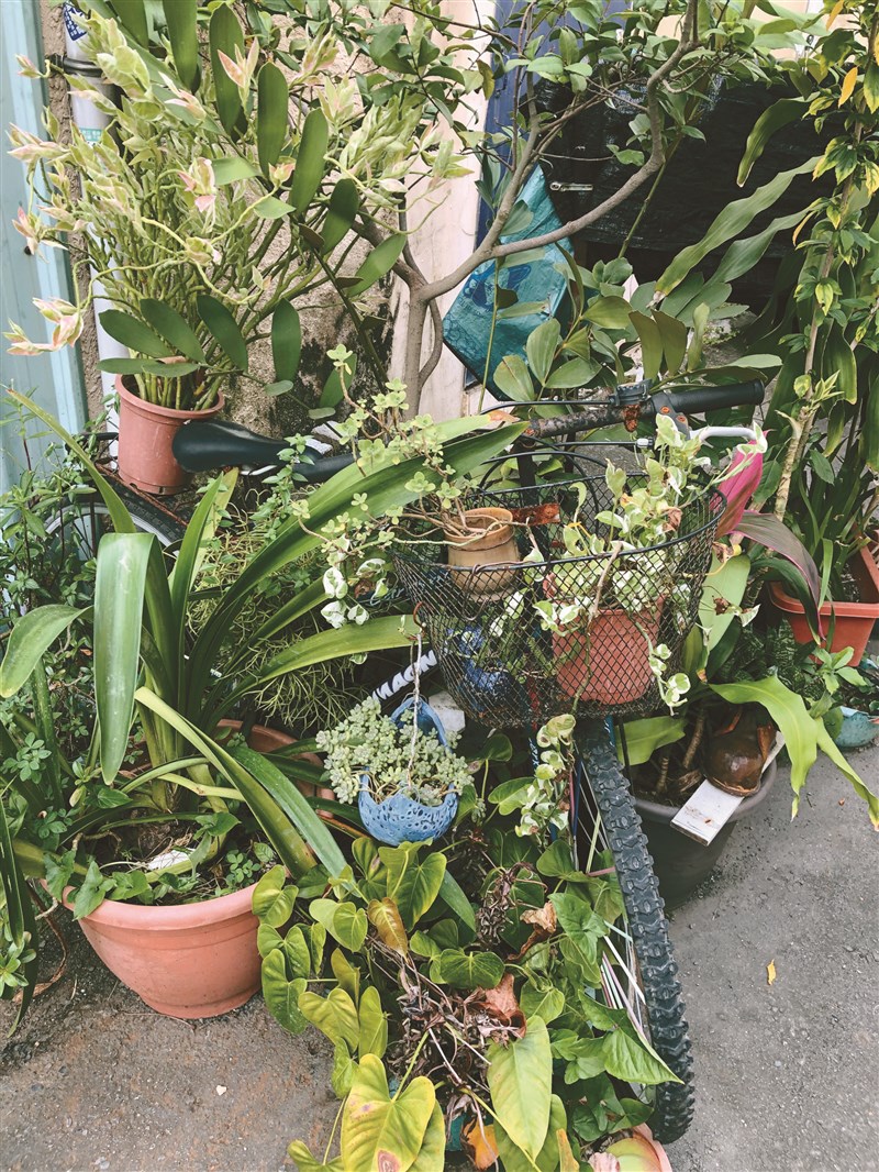 報廢的腳踏車橫亙,菜籃內放幾盆植栽,有多肉植物姬秋麗、碰碰香、青瑣龍;椅座懸掛綠玉樹;手把垂吊心葉毬蘭;後座有紅雀珊瑚,和俗稱「米老鼠」的桂葉紅梅襯托,更顯得生氣盎然,再擺放幾件陶藝作品和創意陶器,讓人看了心情愉悅。