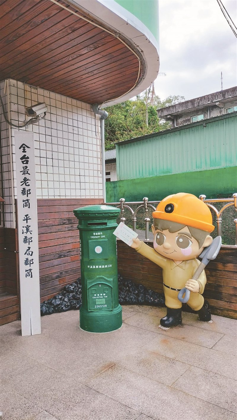 神祕的「老郵筒」就在郵局旁。鮮綠圓柱的外型,大約一個人的高度,它的右邊有個礦工人偶,準備寄信,不禁讓人聯想到這裡曾是礦業發達的地方;左邊有根白色柱子,標示「全台最老郵筒」,後面加註了「昭和十六年(西元1941年)」,心算一下,哇!已經八十四歲了,稱之為「老郵筒」,當之無愧。