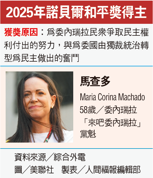 【本報綜合外電報導】挪威諾貝爾委員會10日宣布,委內瑞拉反對派領袖馬查多(Maria Corina Machado)以為委內瑞拉民眾爭取民主權利付出的努力,與為委國由獨裁統治轉型為民主做出的奮鬥,成為本屆和平獎得主。