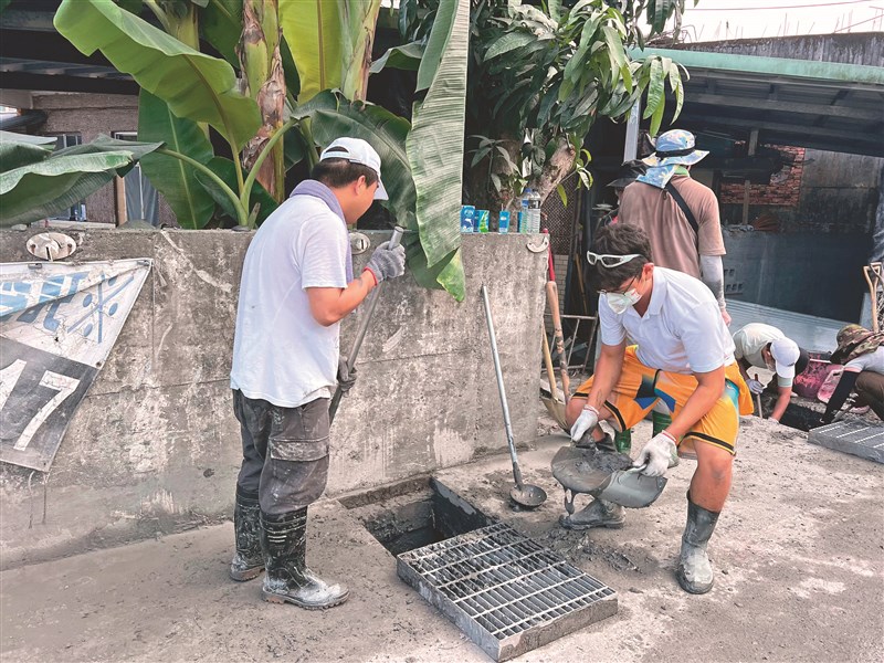花蓮光復鄉災後復原持續進行,許多「勺子超人」在市區道路挖水溝,全身弄得髒兮兮仍賣力挖土。圖/林佳彣