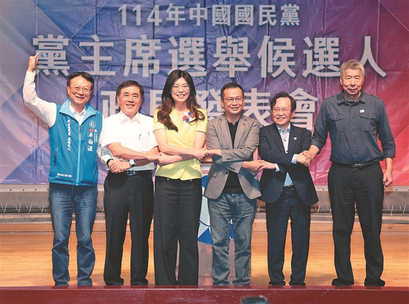 中國國民黨黨主席選舉北部場候選人政見發表會昨在台北市議會禮堂登場,6位候選人卓伯源(左起)、郝龍斌、鄭麗文、羅智強、蔡志弘及張亞中全出席。圖/中央社
