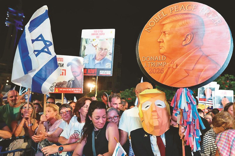 民眾11日聚集在以色列特拉維夫「人質廣場」,有人高舉自製標語「川普2026年諾貝爾和平獎」。圖/法新社