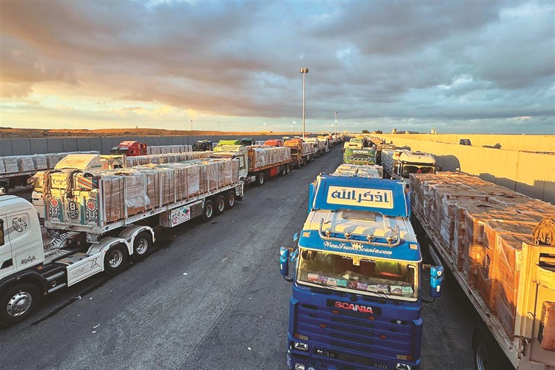 載運人道援助物資的卡車12日停在埃及拉法關卡附近,等待進入加薩。圖/法新社