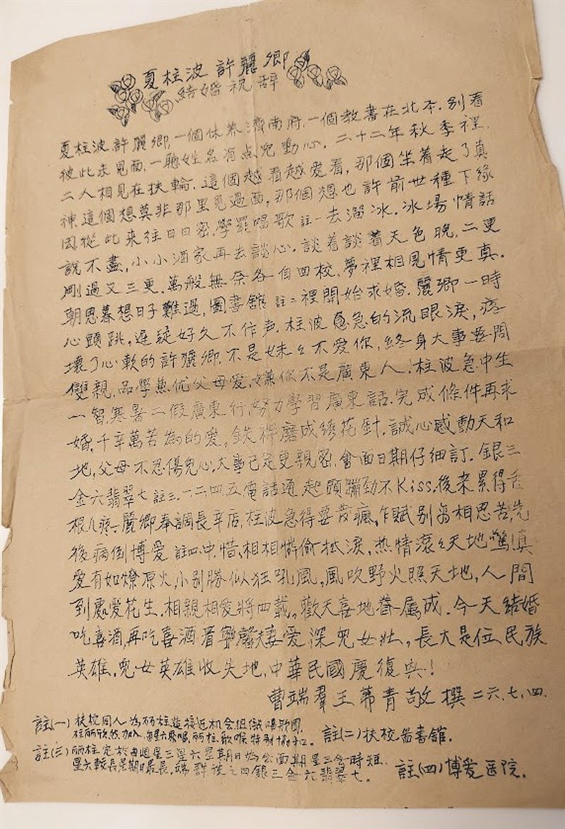 【父母親的話】 民國初年的戀愛故事 文/王正方 |2025.10.13 語音朗讀 46觀看次 字級 大 中 小 作者母親結婚,許麗卿(右)當伴娘。圖/王正方一九三二年許麗卿送給作者母親的照片。圖/王正方 作者父母親寫給許麗卿的婚禮祝辭。圖/王正方 文/王正方許麗卿阿姨和母親在山東濟南共事,兩人最為相知,無話不談,絕對是閨密。她是母親的伴娘,有照片為證。父親的同行好友,語言學教授夏柱波伯伯,二人交情匪淺。小時候我們兄弟常聽爸媽講當年夏伯伯苦苦追求許阿姨的故事,相當精采。年代久遠,許多情節如今已記不太清楚了。故紙堆中找到一份古時候在鋼板上一筆一畫寫就,印出來字跡呈淡藍色的文章:〈夏柱波許麗卿結婚祝辭〉,我母親和老爸署名,日期為民國二十六年七月四日。文辭通俗幽默,讀來煞是有趣,不敢自專,特地錄寫如下,供眾同好欣賞。〈夏柱波許麗卿結婚祝辭〉夏柱波、許麗卿,一個修養濟南府,一個教書在北平。別看彼此沒見面,一聽姓名有點兒動心。二十二年秋季裡,二人相見在扶輪。這個愈看愈愛看,那個坐著走了真神,這個想莫非哪裡見過面,那個想也許前世種下緣因。從此來往日日密,學罷唱歌(註一)去溜冰,冰場情話說不盡,小小酒家再去談心。談著談著天色晚,二更剛過又三更。萬般無奈各自回校,夢裡相見情更真。朝思暮想日子難過,圖書館(註二)裡開始求婚。麗卿一時心頭跳,遲疑好久不作聲,柱波急的流眼淚,疼壞了心軟的許麗卿:不是妹妹不愛你,終身大事要問雙親,品學兼優父母愛,嫌你不是廣東人。柱波急中生一智,寒暑二假廣東行,努力學習廣東話,完成條件再求婚。千辛萬苦為的愛,鐵杵磨成繡花針。誠心感動天和地,父母不忍傷兒心。大事已定更親密,會面日期仔細訂,銀三金六翡翠七(註三),一二四五電話通,起頭繃勁不Kiss,後來累的舌根兒疼。麗卿奉調長辛店,柱波急得要發瘋,乍賦別離相思苦,先後病倒博愛(註四)中。惜惜相憐偷拭淚,熱情滾滾天地驚!真愛有如燎原火,小別勝似狂吼風,風吹野火照天地,人間到處愛花生。相親相愛將四載,歡天喜地眷屬成。今天結婚吃喜酒,再吃喜酒看寧馨,夫妻愛深兒女壯,長大後是位民族英雄,兒女英雄收失地,中華民國慶復興!曹端群、王茀青敬撰 二六、七、四註一:扶輪學校同仁為麗卿柱波造接近機會,組織歌唱團,柱、麗欣然加入,每星期六聚唱,麗柱歌喉特別諧和。註二:扶輪學校圖書館。 註三:麗柱訂於每週三、六、日為會面期,星期三會時短,星期六較長,星期日最長,端群諛之曰:銀三金六翡翠七。註四:博愛醫院。看完這篇文字,覺得它像極了父親隨興道來的順口溜,再加上母親提供豐富資料,將一個世紀前的戀愛故事,描述得栩栩如生,許多生動場景一一呈現在眼前。原來百年前的中國男女知識分子,是這樣子相識相戀,熱情熾盛、愛到難分難解。民國初年受過高等教育的青年,接受西方的自由民主思想,憧憬自由戀愛,雖然熱情如火,卻能謹守傳統禮教,不逾分寸。這不是言情小說中編造出來的情節,幼年在北平成長的那段日子裡,許阿姨夏伯伯一家人和我們不時相聚,留下頗大篇幅的生活記憶。夏伯伯溫文爾雅,聽完爸爸講個俏皮話,總會止不住的縱聲大笑起來;許阿姨輕聲細語,見了我媽二人就在角落裡竊竊密談,有說不完的話。他們有一兒一女,兒子夏雨田,和我同歲。我們倆玩的十分痛快開心,給他起了個別名叫小雷子。夏雨田活潑好動,能說會道的,還會模仿講各地方言,胡搞瞎鬧的鬼點子很多,非常逗樂。勾起一樁童年往事:夏雨田與我鑽進「國語小報」後院的一間小倉庫,裡面黑漆漆的堆滿了灰塵遍布的老報紙和破舊書籍、筆記本。我們亂翻東西,突然跑出來一隻大蠍子,兩個小孩忙著抓蠍子。蠍子的行動很快,好不容易把牠圍到牆角,夏雨田伸手去抓蠍子翹起來的尾巴,被那蠍子順勢轉身螫了一下,痛得他哇哇大叫!蠍子逃走,雨田的手馬上腫得跟包子一樣,蠍子尾巴上的毒居然那麼的厲害,可是他沒有哭,我挺佩服這小子的。事後二頑童被兩家家長狠狠臭罵,結束了不太愉快的一天。一九四八年我們全家遠到台灣,夏伯伯留在北平,自此兩家斷絕音訊數十年。一九七九年我在美國申請到國家藝術基金會的經費,赴北京拍攝紀錄片。父親已經去世,母親從台北來信殷殷囑咐:到了北京打聽打聽夏柱波、許麗卿他們在哪裡?信中詳細寫了夏伯伯原來的工作單位和老地址,說希望能聯繫上最好。母命不敢違背,下飛機就麻煩接待同志幫這個忙。文化革命剛剛結束,尋找老知識分子的工作頗耗費時日,工作完畢回美國的前夕,接待同志告訴我好消息:夏柱波同志解放後派往武漢大學任教,文革後已恢復職位。附上夏同志目前的工作單位地址與聯繫方式。很慶幸未辱使命,總算可以向母親交代了。然而那時海峽兩岸關係緊張,互相直接通信也算觸犯法條。於是我的美國地址成了轉運站,替她們轉達信函。老姊妹倆終於聯繫上了,互相有多封信件往來。一九八○年代初期,母親來美國與我們兄弟二人團聚,老哥有個想法:我們陪媽媽去中國大陸旅遊,武漢列為訪地之一,半個多世紀前的老閨密,可以再次喜相逢了!母親考慮很久,告訴我們年近九旬,不宜遠行。當晚她熬夜,揮毫寫就一副氣魄雄偉、文情並茂的中堂行草,送給許阿姨、夏伯伯,叮囑我們盡快寄過去。兩三年後,幾位先輩老人家都先後回歸道山。兩岸開放,認識了不少