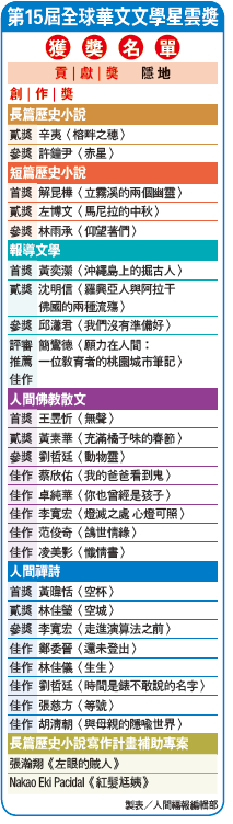 【記者曾博群台北報導】「第十五屆全球華文文學星雲獎」昨日公布得獎名單,年度最高榮譽「貢獻獎」由著名作家暨出版人隱地(本名柯青華)獲得,以表彰他長年在文學創作與出版推廣的卓越成就。