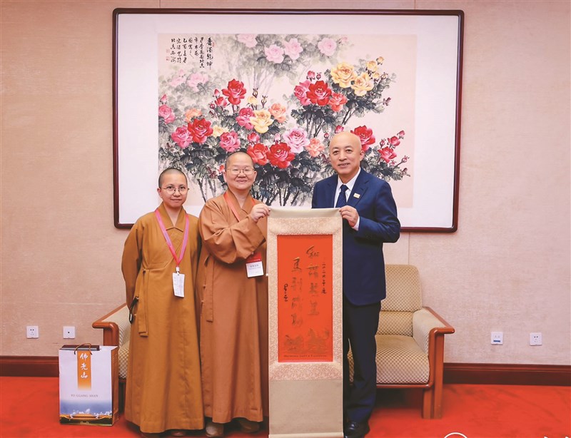 佛館館長如常法師(中)、副館長有賢法師(左),與北京故宮博物院王旭東院長歡喜交流,致贈星雲大師2026年春聯墨寶「和諧共生 馬到成功」卷軸。