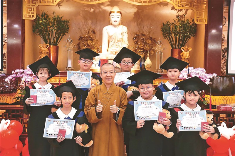 香港佛光道場舉行兒童班、青少年班暨婦女法座聯合開學典禮,永富法師(中)頒發畢業證書和禮物予兒童班畢業生。圖/人間社記者鍾亦倫