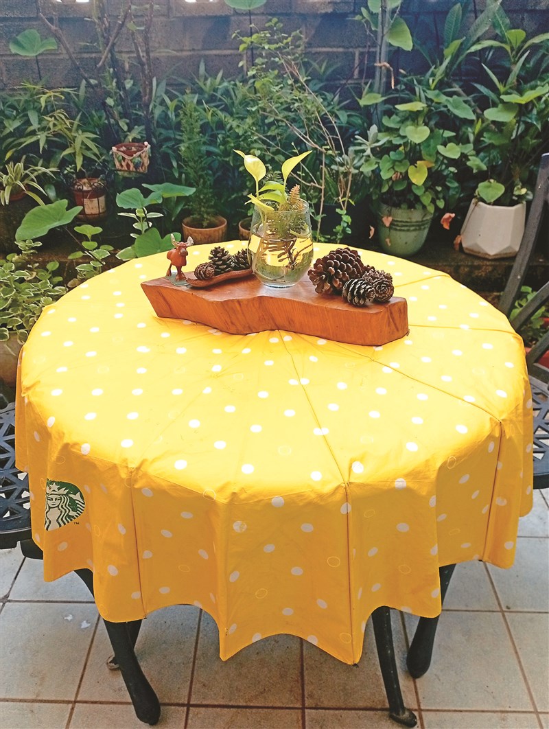 家裡已經上了年紀的戶外桌,表面有明顯的使用痕跡,在雨傘桌布的「一蓋遮三醜」後,以另一種華麗鮮豔的風貌登場。 在中央擺些撿拾來的乾松果和水生植物裝飾,隱藏起傘布中間的孔洞,鮮明的「萬綠叢中一點亮」,讓後院有了不一樣的風景。