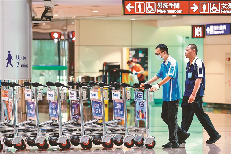 勞動部長洪申翰認為,勞工請病假被沒收當月的全勤獎金,並不合理。圖為桃機航廈內工作人員收集行李推車。圖/黃仲明