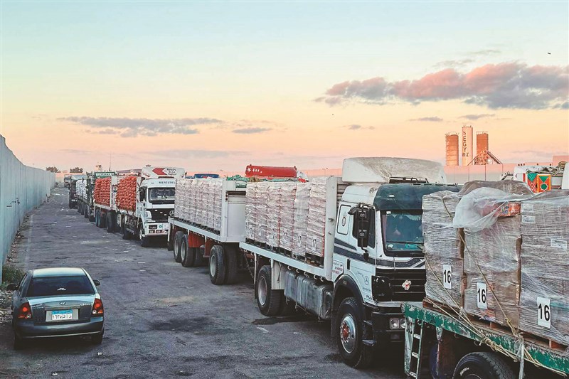 在以色列宣布重新開放口岸後,載滿人道救援物資的貨車,15日等待進入加薩走廊。圖/法新社
