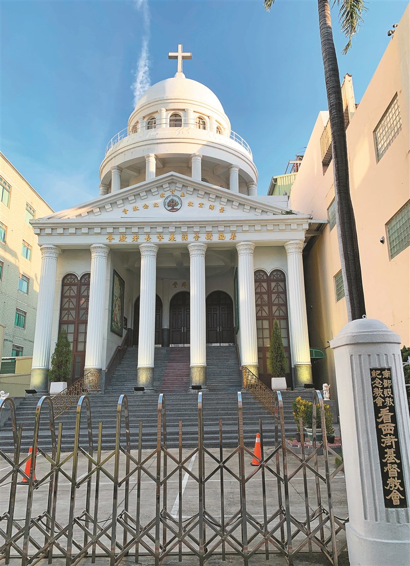 這棟雪白教堂的正面有著六柱式門廊與山牆,白色柱頭分成雙層,上層是三角折線,下層是蛋鏢造型;柱礎是灰黑色的洗石子,連結拾級而上的暗色系階梯。屋頂為雙層圓頂蛋型,上面直立著白色十字架,挑高的造型加上教堂前方空地,對比兩旁窄仄的老屋和充滿道教廟宇氛圍的巷弄,更顯出它的獨特。