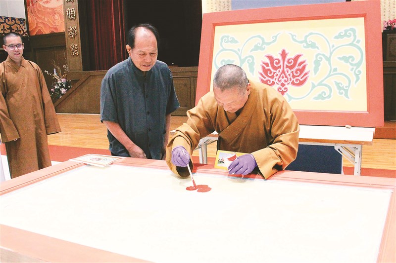 佛光山福慧家園十四日舉行佛光山大雄寶殿藻井彩繪活動,由慧傳法師(右)率先畫下第一筆,旁為彩繪藝師蘇榮仁。圖/人間社記者李生鳳