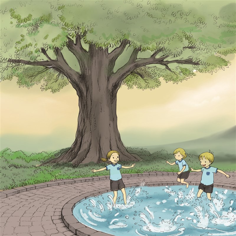 終於熬到走進公園,只見萬物皆藏在婆娑樹影間安養生息,撫慰著被驕陽燒灼的傷口。知了不知躲在榕樹何處鼓瑟,震動著翅翼,將世界調成相同的音頻。沉浸在夏日的噪音裡,我逐漸感到頭腦昏沉。突然,一道道水柱喚醒了沉睡的公園,也濺溼了人們的衣袖。