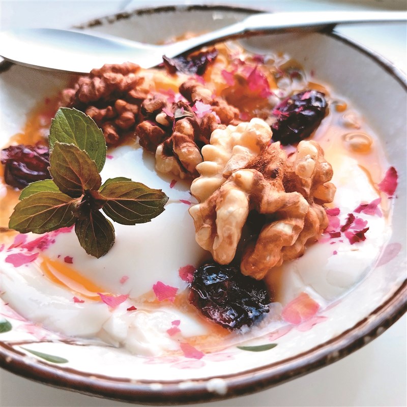 或許生活平凡庸碌日復一日,外界紛擾早已讓人心厭倦、煩悶懈怠疲累、負能量充滿,不妨腳步稍作停歇,為自己做一碗心花開的樸實美味:舀上幾匙軟嫩豆香濃醇鮮豆花,加上新鮮馥郁百香果漿,灑入微酸帶甜的蔓越莓果乾,配搭幾顆現剝核桃仁,再採摘庭院水漾清新甜薄荷、點綴香氛粉玫瓣,每天的豐盛滋潤與清新自在,就從繽紛的美味豆花開始。