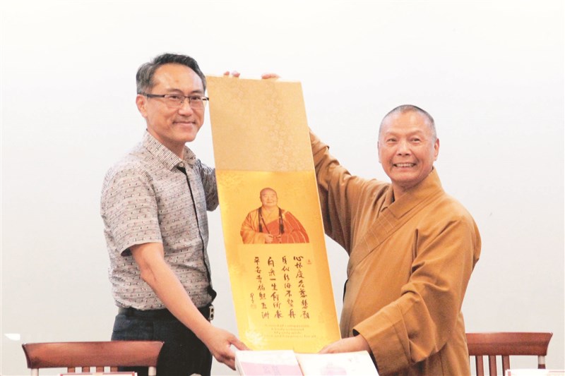 高雄市大樹區的國防部軍備局第205廠一行約80人,參訪佛光山,常務副住持慧傳法師(右),致贈佛光山開山祖師星雲大師法相,由上校政戰主任熊碩成代表接受。圖/人間社記者李生鳳