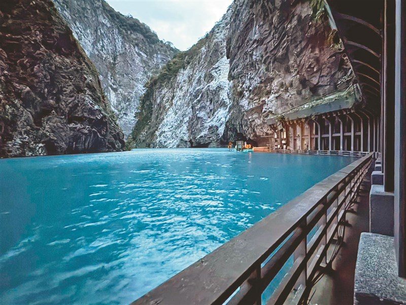 太魯閣國家公園燕子口邊坡崩塌,在立霧溪上游形成堰塞湖,湖水溢流、滲流至立霧溪,水位高度目前已接近台8線中橫公路,圖為靳珩隧道西口明隧道工程現況。圖/中央社