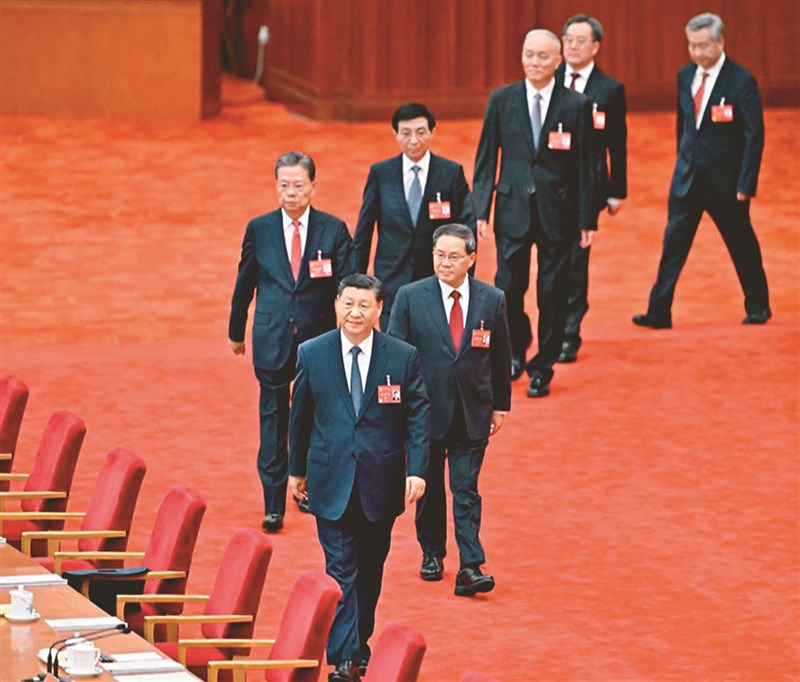 中共二十屆四中全會將於今日舉行。圖為三中全會時,中共中央七常委進場的畫面。圖/新華社