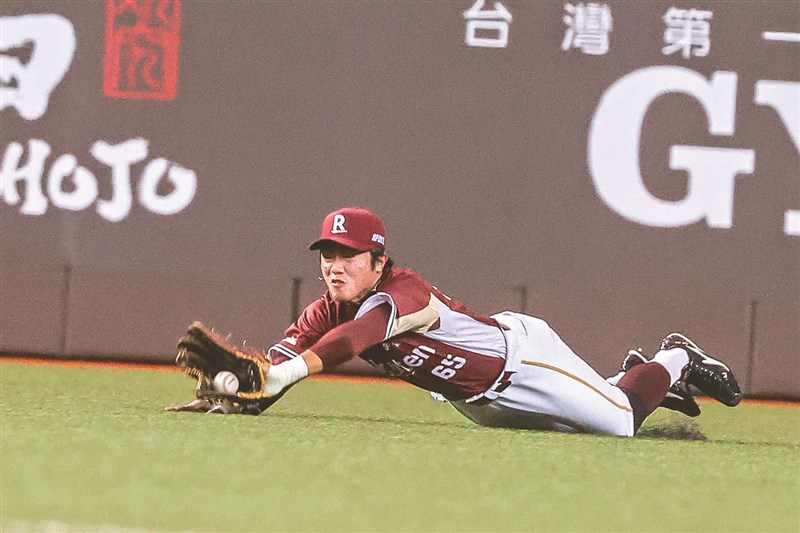 中職總冠軍賽G2,樂天桃猿和中信兄弟昨晚開打,4局下樂天林政華飛撲接殺外野高飛球。圖/曾原信