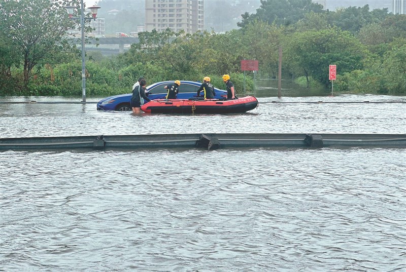 受豪大雨、抽水站抽水及大潮影響,昨日上午新北市二重疏洪道內道路積水,有部自小客車受困,經警消救援,車上2人順利脫險。圖/中央社