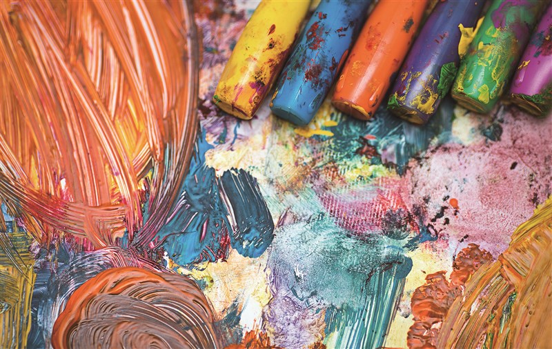 油粉彩也可挑相近色的粉蠟筆來繪製。兩者都可以厚塗,畫出飽滿的色塊,接著用手指將顏料推開,由於油粉彩的顏料比較軟,所以很好推,粉蠟筆則要施加較大的力道 。