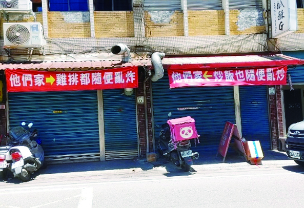 羅東小鎮是全台灣面積最小的鄉鎮,地狹人稠,尤其到了周末假日,人來人往,水洩不通,窄小的馬路人車紛沓,騎腳踏車的要過馬路,甚至得扛著車橫越。雞排、炒飯店位在中山路上,貫串東西交通,台鐵鐵軌離這兒不遠,每有列車經過,聽在耳裡,哐啷哐啷的響聲,雖習以為常,卻很有亂亂的節奏感。人們經過這兩家店門口,總禁不住張望良久。炒麵這一家姓劉,雞排這一家姓張,都是上了年紀的夫婦經營的,老鄰居了,雙方和和氣氣做著生意。只不知何時來了這兩條布條,瞬間引起一陣注意,成為談話的焦點。