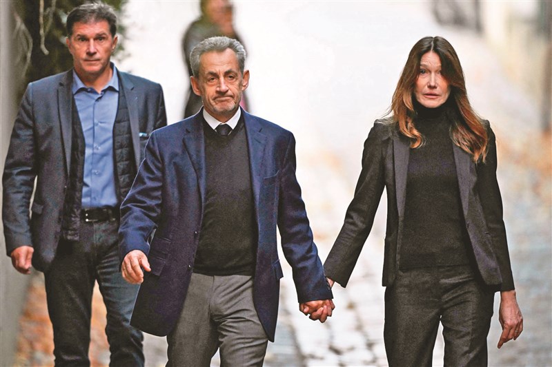 法國前總統沙科吉(左)與妻子、歌手兼名模卡拉布魯尼(右)牽手步出住處,前往監獄服刑。圖/法新社