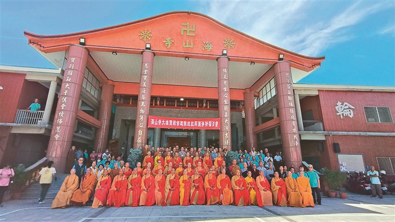 諸山長老比丘、長老尼比丘尼與各界貴賓護法信眾,見證海山寺百年佛剎修建圓成,海山寺住持惟悟長老尼(前排左9)偕全體貴賓於海山寺大雄寶殿前合影。圖/人間社記者林碧月