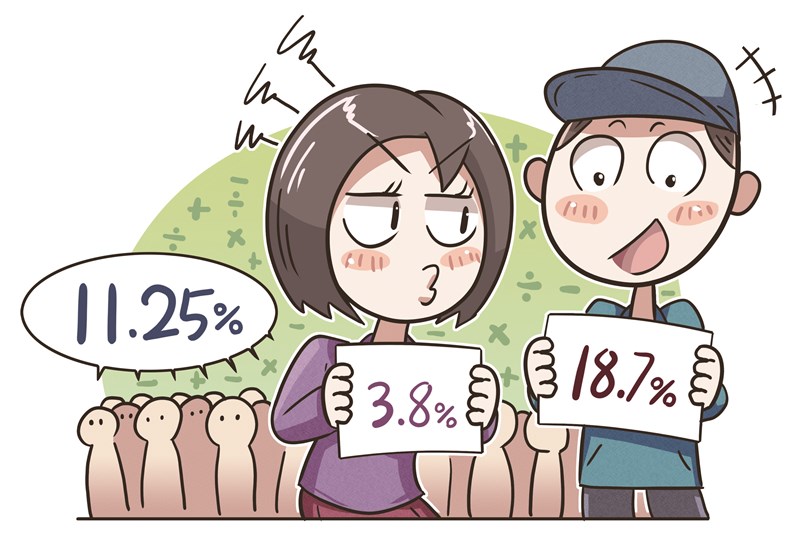 把男女兩種情況綜合起來,全體人口平均約11.25%。換句話說,每100個人裡,大概有11或12個人的身分證號裡藏著3個「1」。