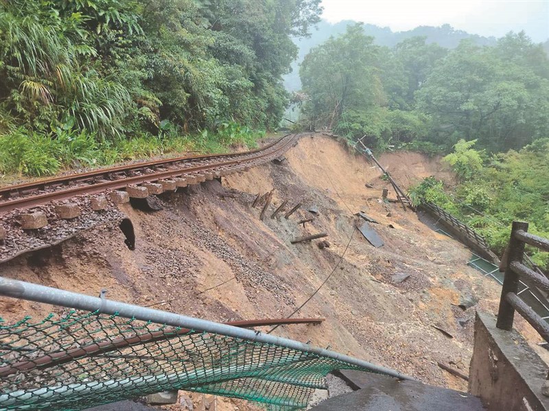 新北市平溪區因大雨沖刷造成地層滑動,引發嶺腳車站附近至嶺腳瀑布處鐵軌底部路基掏空,長逾百公尺。