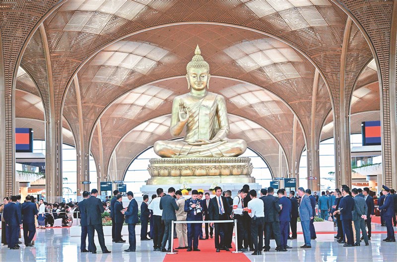柬埔寨耗資20億美元(約新台幣614億元)、由中國大陸興建的德崇國際機場(Techo International Airport,於20日正式開始營運,首航航班柬埔寨航空K6 611從中國抵達。法新社報導,這座新機場取代金邊的舊機場,成為首都主要航空輸運樞紐。圖為機場上安奉的金佛,見證著新機場的開放。圖/法新社