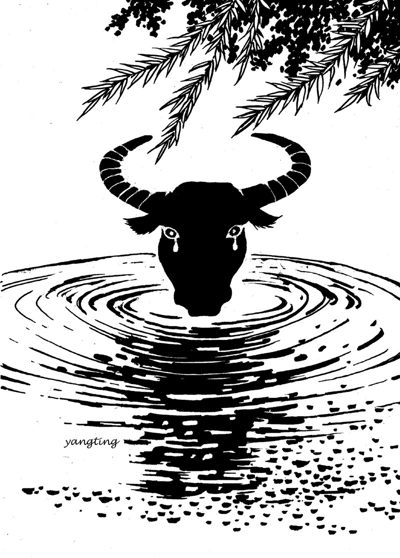 在鄉村,水牛經常泡在水裡,時而低喃,時而沉默,這是常見的景象。今天,我們要欣賞一首兼具視覺與哲理的圖象詩,詩人詹冰的作品〈水牛圖〉。