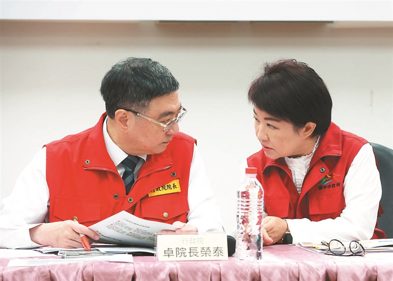 行政院長卓榮泰(左)昨天與台中市長盧秀燕(右)前往非洲豬瘟前進應變所開會。圖/黃仲裕