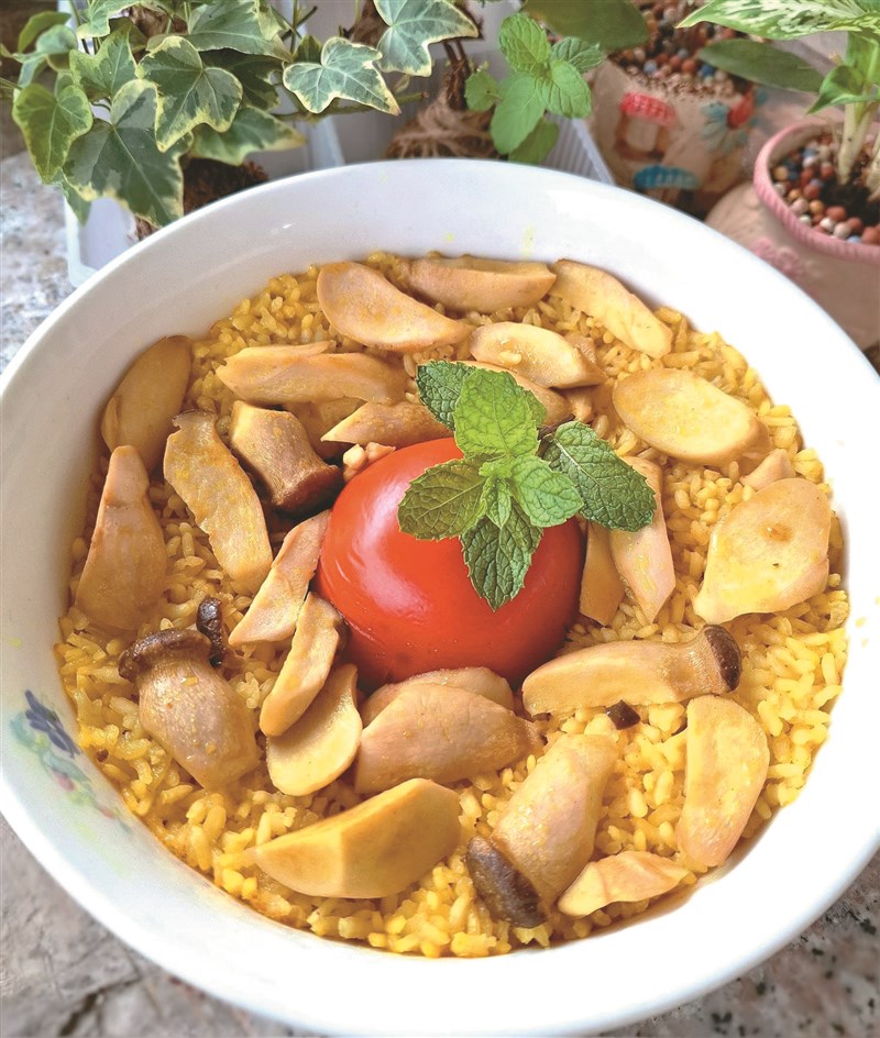 白米2杯、杏鮑菇適量、番茄1顆、薑黃粉1大匙、鹽1小匙、食用油適量