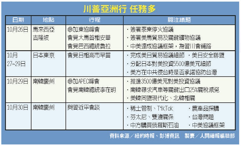 中美談妥 貿易協議框架 |2025.10.27 語音朗讀 54觀看次 字級 大 中 小 美國財政部長貝森特(左)與中國大陸副總理何立峰(右),25日在吉隆坡會談。圖/新華社川普亞洲行 任務多 資料來源/紐約時報、彭博資訊 製表/人間福報編輯部中美第5輪經貿磋商結束,雙方官員為習川會晤建立一個成功的框架。圖為26日川普(右1)與美國官員,出席馬來西亞吉隆坡東協峰會。圖/美聯社 【本報綜合外電報導】美國總統川普與中國大陸國家主席習近平預計30日在南韓舉行眾所矚目的「習川會」。美國財長貝森特26日說,中美的談判官員已為這場峰會,建立非常正面的架構。針對出口管制、芬太尼及船舶費用等一系列歧見達成共識,待兩國領袖敲定最終協議,美國可望不對大陸加徵100%關稅,北京也可能延後全面稀土管制實施時間。川普本人26日更在年度東協(ASEAN)峰會場邊對媒體預料,「會和中方達成一項良好的協議」。中美自25至26日在馬來西亞吉隆坡舉行自5月以來的第5輪面對面磋商,陪川普出席該峰會的貝森特在場邊說,中美與談官員這兩天討論採購農產品、大陸抖音海外版TikTok、芬太尼、貿易、稀土和整體雙邊關係等廣泛議題。26日在前述的磋商結束後,貝森特表示,「我會說,這次磋商具建設性、深遠又深入,讓我們能向前推進,並建立非常正面的架構,為兩國領袖會面奠基」。但他不忘強調,本周習川會若達成任何延長中美貿易戰休兵的協議,那都屬於「川普總統本人的決斷」。貝森特也表明,此次磋商旨在替川、習接下來在南韓舉行的峰會,搭建一個成功的架構,「而我認為,我們的確辦到了」。貝森特另提到,川普此前揚言對陸輸美商品加徵100%關稅,現在「其實不在考慮範圍內了」。美官員強調:不棄台灣換優惠彭博26日報導說,前述的種種發言及發展,皆為中美發出的讓人鼓舞信號。外界指出,中美延長休戰協議與討論稀土議題,意味雙方正試圖確立一個避免緊張關係升級的談判框架,同時為後續處理更具爭議的問題預留空間。不過,美國國務卿魯比歐25日說,川普政府與大陸談判過程中,不會放棄華府對台灣的長期支持,「我不認為你們會看到那種貿易協議,內容是我們放棄台灣,換取得到貿易上的優惠待遇。沒人在考慮那件事」。與此同時,新華社報導,中美雙方建設性地探討了出口管制、延長對等關稅暫停期、美方301船舶徵費等議題,並達成「基本共識」,將由雙方各自履行國內批准程序。大陸國務院副總理何立峰表示,中美經貿磋商成果得來不易,需要雙方共同維護,希望美方與中方相向而行,進一步累積互信、管控分歧。大陸商務部國際貿易談判代表李成鋼形容,這兩日的談判過程是「非常緊張的」,他指美方表達立場是「強硬的」,中方維護利益則是「堅定的」。川普與高市首會 牽動台灣議題川普出訪亞洲,預計28日與日本新任首相高市早苗會談。《華盛頓郵報》社論指出,對於這場會面,外界大多聚焦貿易及日本國防支出等爭議上,不過,最重要的議題仍未浮上檯面,也就是台灣。該社論指出,高市是保守派「日本優先」的民族主義者,主張打擊非法移民並提高國防支出,與川普有許多共同點。儘管美日仍持續針對汽車關稅、駐日美軍費用等議題談判,但日本政策方向許多令川普滿意。 前一篇文章 習川會將談台灣議題 川普:我很尊重台灣 下一篇文章 泰柬簽署和平協議 川普:完成不可能任務 熱門新聞 01【閃文集】 一生擁抱自然——珍‧古德2025.10.2102佛光慈善音樂會 援助北宿霧重建2025.10.2203【小城故事】 兩冤家2025.10.2104佛光山新馬寺 為逾2200考生祈福2025.10.2105【歡喜收穫】 圓一個幸福園藝夢2025.10.2106東禪寺考生祈福會 助正念自信應考2025.10.2207談談蠟筆2025.10.2108粉蠟筆與油粉彩差別2025.10.2109極樂佛光童軍慶重陽 童行陪伴信仰傳承2025.10.2310大阪佛光人走入社區 結緣清荒神地車祭2025.10.21 訂閱電子報 台北市 天氣預報 台灣一週天氣預報 相關報導 泰柬簽署和平協議 川普:完成不可能任務習川會將談台灣議題 川普:我很尊重台灣 太空人學校特訓 月球出任務白宮宣布 習川會10月30日APEC 峰會登場醫師扮獅子王 逗樂看診病童從垃圾堆到伸展台 破布變時尚