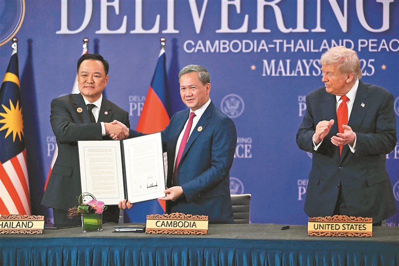 第47屆東協峰會期間,泰國總理阿努廷(左)與柬埔寨總理洪馬內(中),在美國總統川普(右)見證下簽署和平協議。圖/法新社