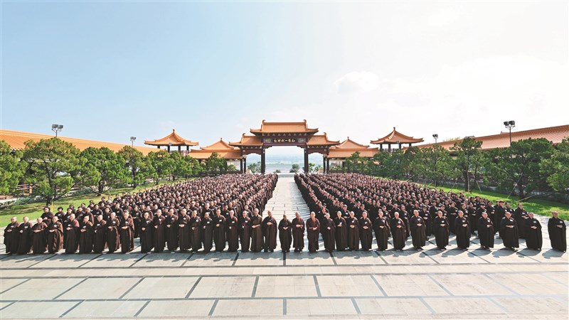 「佛光山2025年傳授五戒菩薩戒會」10月26日前往禮拜佛光山開山祖師星雲大師,圖為慈容法師(前排右16)、慧傳法師(前排右15)、慧倫法師(前排右14)、慧昭法師(前排右17)、慧思法師(前排右18),與全體戒子合影。圖/人間社記者趙啓超