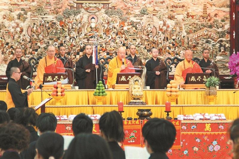 「佛光山2025年傳授五戒菩薩戒會」,恭請佛光山住持心保和尚(中)為得戒和尚、佛光山退居和尚心培和尚(左)為教授和尚,慧龍法師為羯磨和尚。圖/人間社記者李生鳳