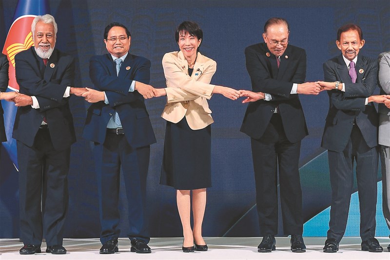 東協峰會26日在吉隆坡舉行,日本首相高市早苗(左3)與越南總理范明政(左2)、馬來西亞總理安華(右2)、汶萊首相蘇丹哈山納(右1)拍合照。圖/法新社