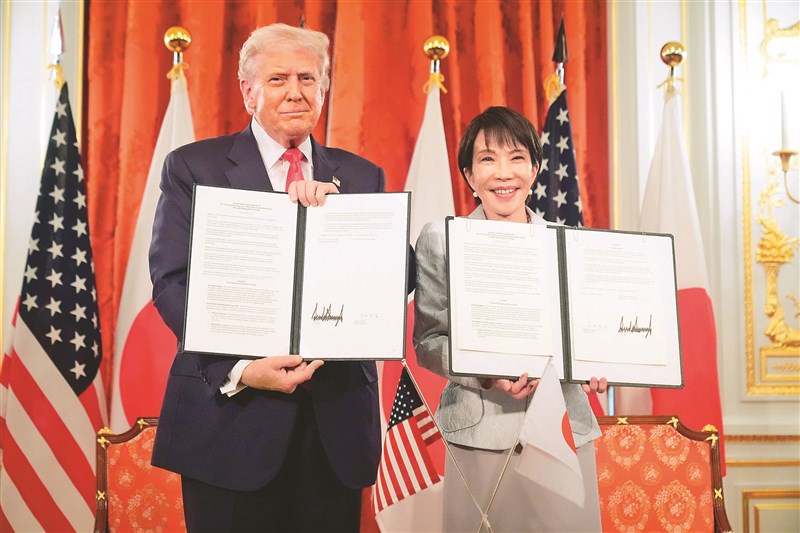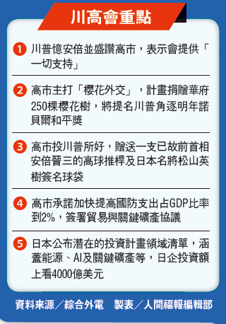 川高會 簽關稅、稀土協議 |2025.10.29 語音朗讀 49觀看次 字級 大 中 小 川高會重點 資料來源/綜合外電 製表/人間福報編輯部川普(右)28日在美軍橫須賀基地,盛讚高市早苗是「贏家」,並強調美日同盟的重要性。圖/美聯社 川普(左)與高市早苗28日在東京會晤後簽署協議,象徵美日進入「黃金新時代」,雙方承諾加強貿易合作與關鍵礦物開發。圖/美聯社 【本報綜合外電報導】美國總統川普28日在東京會晤日本新首相高市早苗,讚揚美日同盟關係堅定,肯定她推動防衛費擴大的計畫,強調美國將持續作為日本最堅強盟友,兩人也簽署關稅協議及稀土合作相關的協議。川普27日抵日,28日在迎賓館赤坂離宮會晤高市,其後兩人共乘美國總統專用直升機到美軍橫須賀基地視察美軍航艦,兩人均強調持續合作的承諾;晚間,川普在東京會晤企業人士,談到預定30日登場的習川會說,這將是重要會面,認為將有非常好結果。高市說,已與川普重申台灣海峽和平穩定的重要性,但鑒於習川會即將登場,婉拒評論兩人就中國大陸問題的討論細節。川、高兩人也反對以武力或脅迫片面改變現狀。高市說,美日已成為世界最偉大同盟,日本將與美國一起貢獻於世界和平與繁榮,「我將重振強勢的日本外交。為推進自由且開放印太,日美將加強合作」,與川普共創美日黃金新時代。高市也說,日本將增加國防預算,回應川普要求盟友分擔更多防衛責任的立場,藉此爭取美方理解日本加強防衛能力的政策。高市向川普表明,達成防衛費達GDP2%的目標後,仍將持續增加國防預算。川普與高市在會談時氣氛友好,雙方互相讚賞。高市告訴川普,將因他在外交上的努力提名他為諾貝爾和平獎候選人。川普則贈送印有金色字樣「JAPAN IS BACK」(日本回來了)的簽名高爾夫帽作為禮物。高市同時轉贈已故前日相安倍晉三的球桿,與名人賽冠軍松山英樹簽名球袋給川普。美日同盟 貿協內容正式化 川普與高市在會談後,簽署兩份文件,一份代表美日關係進入「黃金新時代」,另一份涉及關鍵礦物。這些協議目標將部分由前任日本首相達成的貿易協議內容正式化,其中包括日本承諾出資5500億美元(約新台幣16.8兆元)於美方項目。法廣(RFI)東京特約記者報導,「黃金新時代」文件涉及雙方今年稍早就戰略投資及共同國家利益達成的共識。關於日美關稅協議,日本的5500億美元對美投資計畫,日美政府於28日共同整理投資候選項目文件,當天由日本經濟產業省在川高會期間公布。前述項目內容包括,三菱重工與東芝考慮參與美國核電企業西屋電氣主導的核電站及小型模組化反應器(SMR)建設,三菱電機將提供用於數據中心發電系統,此外,軟銀集團、日立製作所、村田製作所等企業也將參與;21個項目的總規模預計約4000億美元(約新台幣12.2兆元)。川普預告 今日會見黃仁勳川普與高市在東京會晤後,共搭美國總統直升機專機「陸戰隊一號」前往視察神奈川縣美軍橫須賀基地的核動力航空母艦喬治華盛頓號。川普在該艦向數千名軍人演說時邀高市上台,盛讚「這位女性是贏家」,強調美日同盟重要性;川普還提到在防衛美國上,其政府不會像前幾屆政府一樣「政治正確」,今後「若我們開戰,就一定贏」。此外,川普28日晚間還與日本商業人士見面,並在現場演說時透露29日將會晤輝達執行長黃仁勳。 前一篇文章 川普:可能取消「對陸301調查」、10月30日簽TikTok協議 下一篇文章 中美貿易戰休兵 習川會焦點轉向台灣 熱門新聞 01極樂佛光童軍慶重陽 童行陪伴信仰傳承2025.10.2302佛光會贈《365日》 泰國上議院珍藏2025.10.2403國際佛光會 3度獲公益金質獎2025.10.2304建築師揮灑狂想 太空鴨降落南韓2025.10.2305越南中央佛教執委會 參訪光明大學2025.10.2306【歲時.節氣】霜降──草木搖落露為霜2025.10.2307認識日本單位2025.10.2308【相守一輩子】隨時調整心態 守護婚姻2025.10.2309柬埔寨德崇國際機場 安奉金色大佛2025.10.2310風電機庇蔭 聰明羊群躲陰影涼快2025.10.23 訂閱電子報 台北市 天氣預報 台灣一週天氣預報 相關報導 川普:可能取消「對陸301調查」、10月30日簽TikTok協議中職總冠軍賽 桃猿奪隊史第8冠泰柬簽署和平協議 川普:完成不可能任務中美談妥 貿易協議框架習川會將談台灣議題 川普:我很尊重台灣 太空人學校特訓 月球出任務