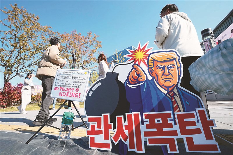 一幅反對美國總統川普訪問南韓的漫畫,28日出現在首爾美國大使館旁,上面寫著「關稅炸彈」。圖/美聯社